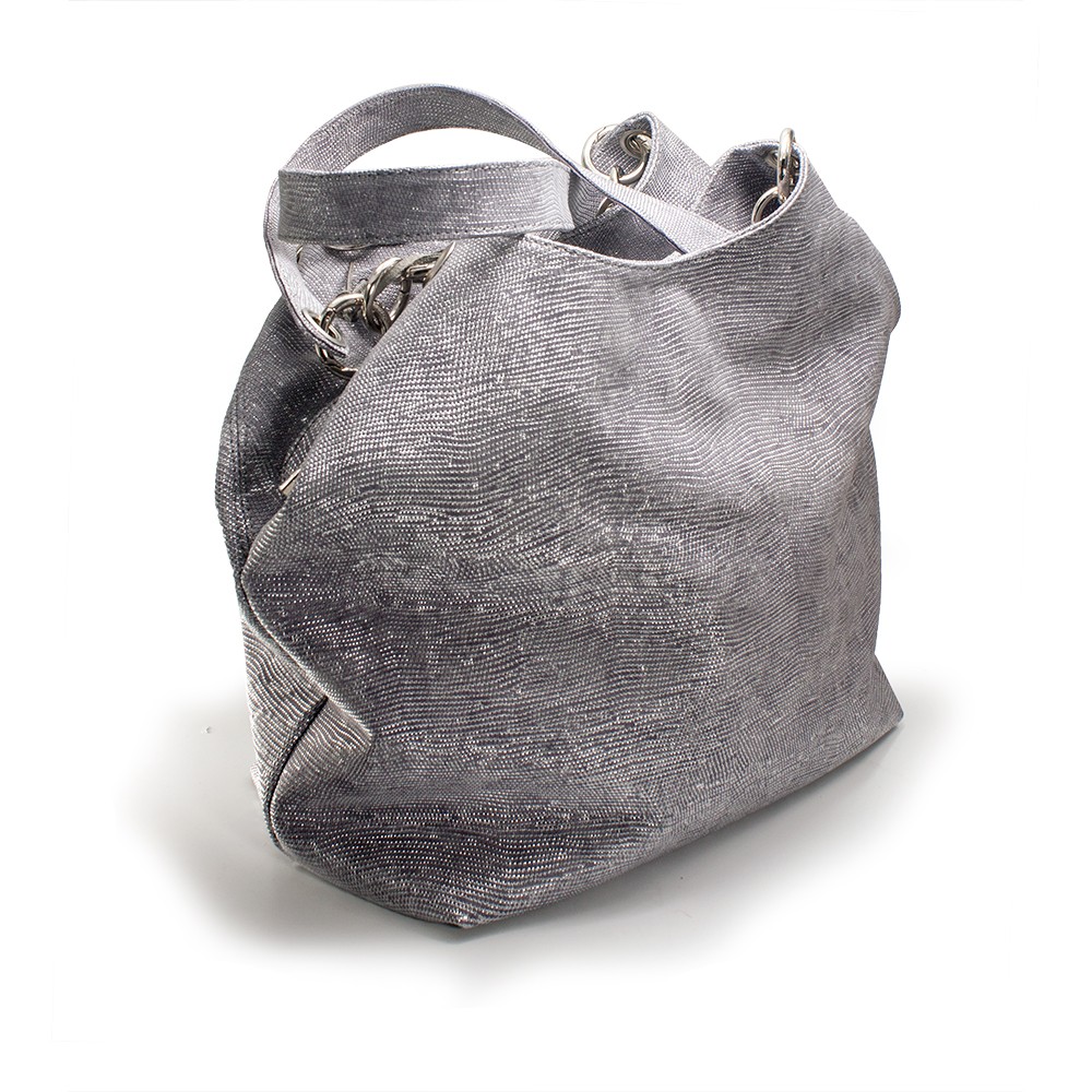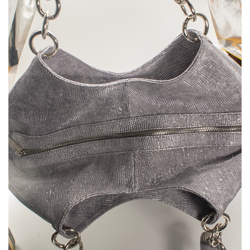 Kalinda este o geanta de dama mare, din piele naturala argintie cu sclipiri, de o calitate foarte buna. Geanta incapatoare, cu o structura fluida, foarte chic, o geanta casual, frumoasa, practica si eleganta in acelasi timp.