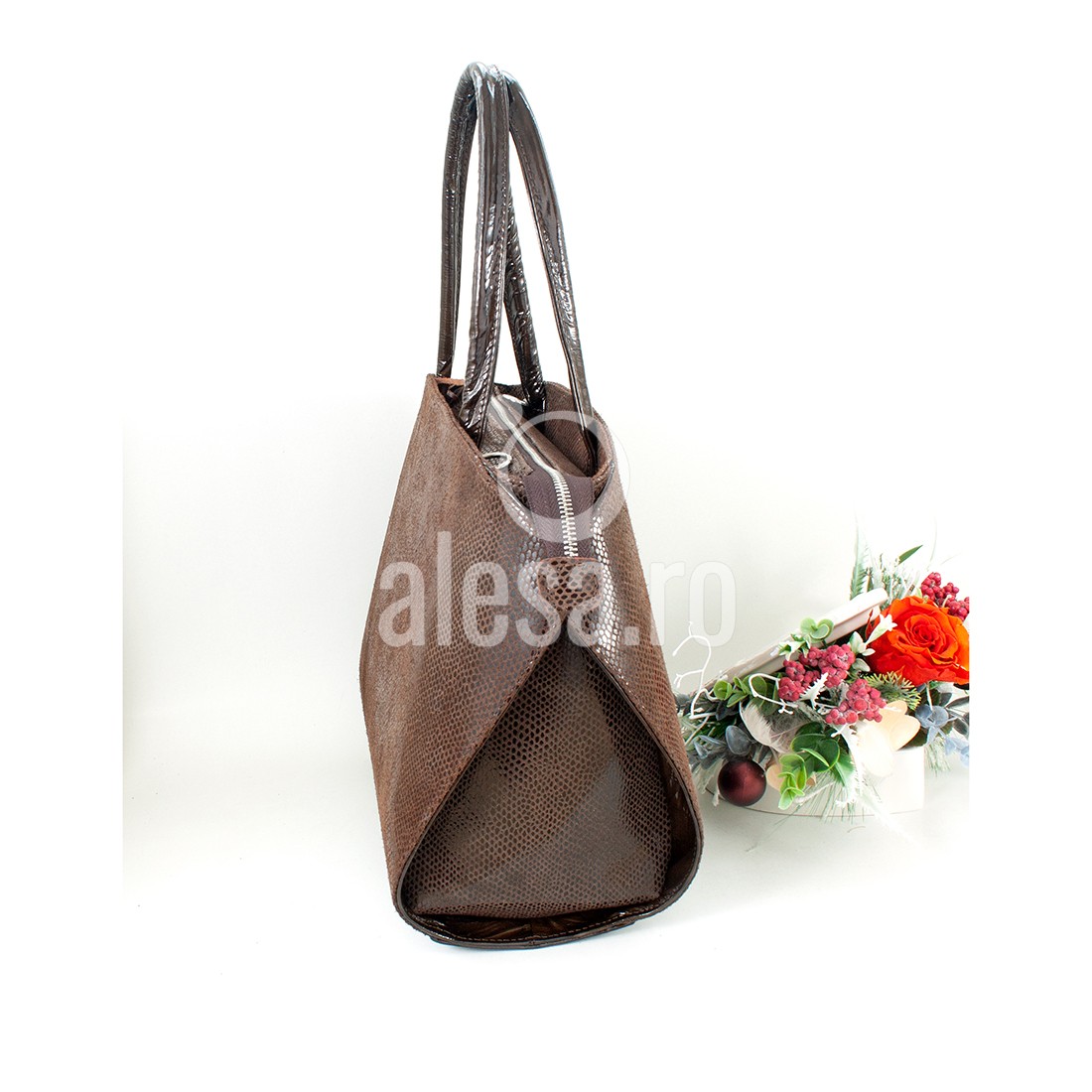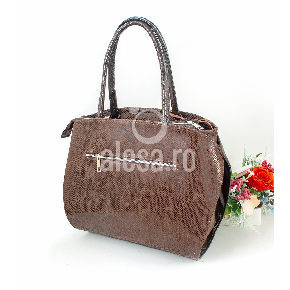 Culoarea superba, maroul deosebit din imagine, pigmentat amplifica infatisarea eleganta si designul cu totul deosebit in forma de inima, la care se adauga materialul de o calitate superioara. Geanta se inchide cu fermoar si este prevazuta cu un buzunar cu fermoar in partea din spate, la exterior. Baza gentii este dreapta, prevazuta cu patru picioruse metalice care ajuta la sustinerea gentii, de asemenea, dispune de doua manere care permite purtarea ei atat in mana, cat si pe umar.