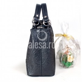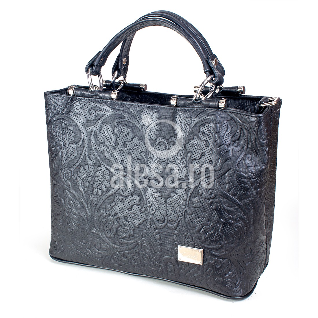 Pielea din care este realizata, o piele neagra, cu flori in relief ii confera o eleganta aparte, dupa cum puteti vedea in imagini. Pielea este mata, frunzele mari in relief ii confera un aspect elegant, stilat, e clar, atrage privirile imediat. La cerere, poseta poate fi realizata si impreuna cu un portofel asortat.