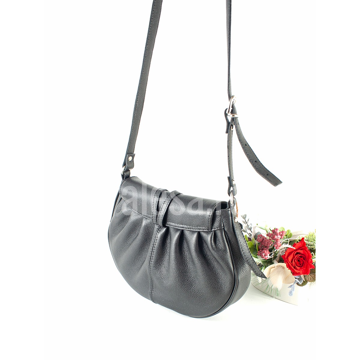Poseta este realizata din piele naturala si este deosebit de practica si versatila. Cureaua de umar este ajustabila, permitand in acest fel ca poseta sa poata fi purtata atat pe umar cat si crossbody, cu o lungime de 115 cm. Interiorul este destul de incapator, necompartimentat, iar in interior gasim un buzunar cu fermoar pe peretele din spate.