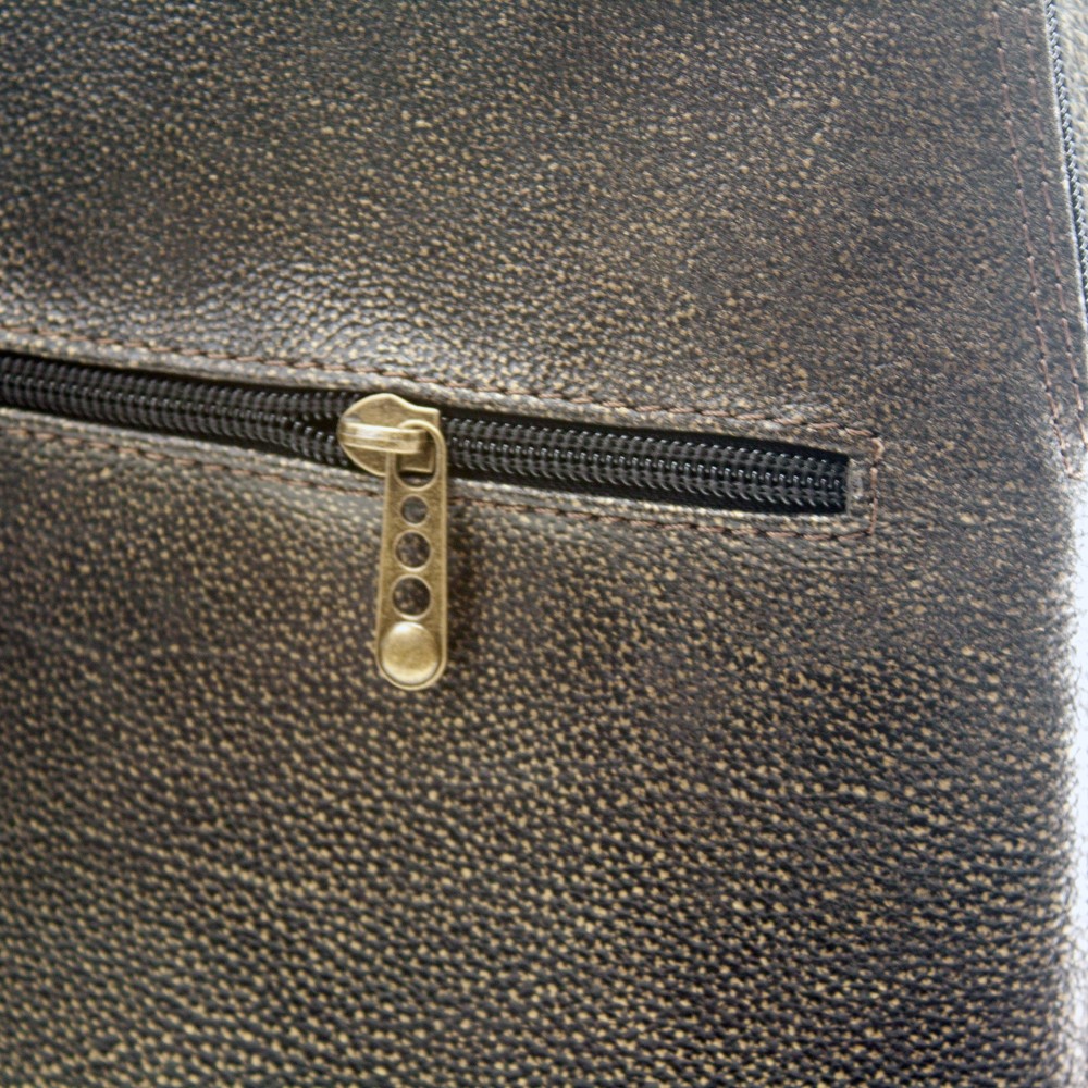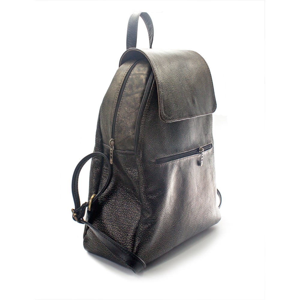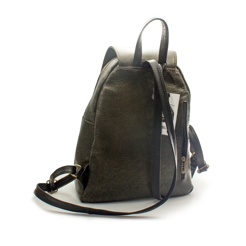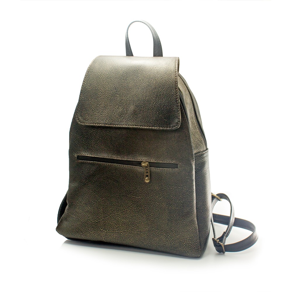 Baza este dreapta, plata, fara picioruse, realizata din piele. Rucsacul are doua curele de umar ajustabile si un maner negru, pentru a-l putea purta usor, iar capacul se inchide cu buton magnetic.